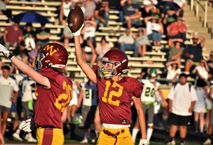 Mountain View's Lucas Bautista (12) holds up the football after recovering a fumble against Timpanogos on Friday, Sept. 2, 2022.Head Coach: Abe Poduska (3rd season)