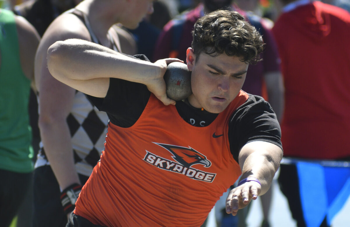 - Skyridge senior Cameron Beck prepares to throw the shotput in the 6A boys competition on the first day of the 2023 state track meet at the Robinson Track and Field Complex in Provo on Thursday, May 18, 2023.