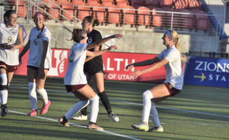 - Maple Mountain players celebrate with senior Mika Krommenhoek (right) after she scored a goal during the 5A semifinals against Olympus at Zions Bank Stadium in Herriman on Tuesday, Oct. 17, 2023.