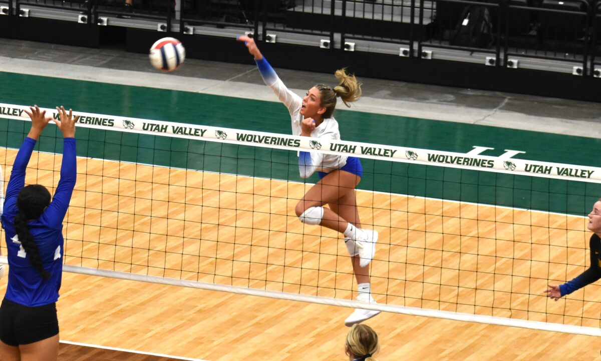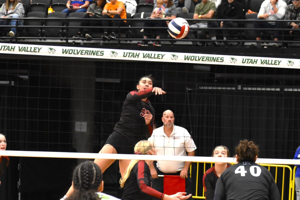- Orem’s Sami Blackett takes a swing out of the back row during a 4A girls volleyball state tournament match against Dixie at the UCCU Center in Orem on Wednesday, Oct. 25, 2023.