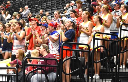 - The Mountain View student section cheers during a 4A girls volleyball state tournament match against Ridgeline at the UCCU Center in Orem on Wednesday, Oct. 25, 2023.