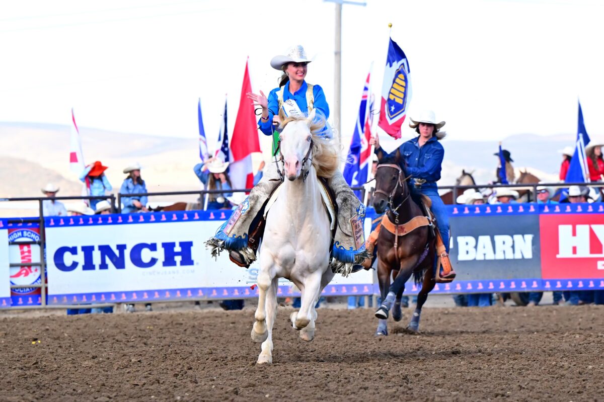 - Timpanogos senior Aubrie Christensen rides into the arena as part of the National High School Rodeo Queen competition at the 2024 National High School Rodeo Finals in Rock Springs, Wyo.
