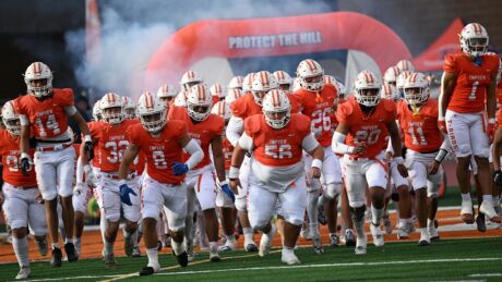 - Springville players take the field before the 5A second round game against Timpview in Provo on Friday, Nov. 1, 2024.