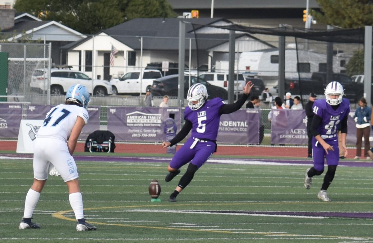 - Lehi’s Gavin Fenn (5) kicks off against Layton in a 6A football state playoff game on Friday, Nov. 1, 2024.