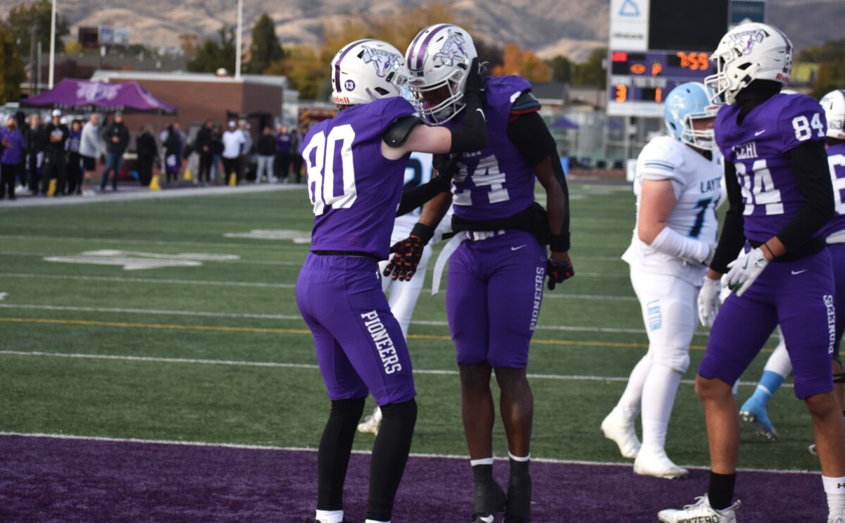 - Lehi’s DeVaughn Eka (24) celebrates with teammate Ivan Balle after scoring a touchdown against Layton in a 6A football state playoff game on Friday, Nov. 1, 2024.