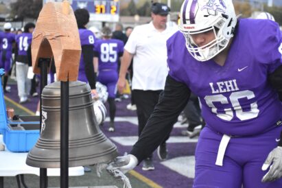 - Lehi’s Matekitonga Havea rings the team’s bell after the Pioneers scored a touchdown in a 6A football state playoff game against Layton on Friday, Nov. 1, 2024.