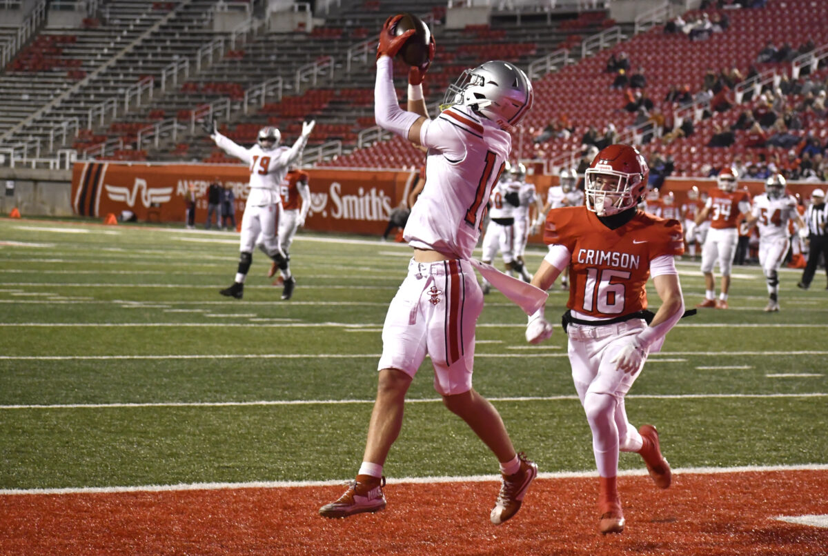- Spanish Fork senior Brock Jacobson catches a touchdown pass during the 4A championship game against Crimson Cliffs at Rice-Eccles Stadium on Thursday, Nov. 21, 2024.