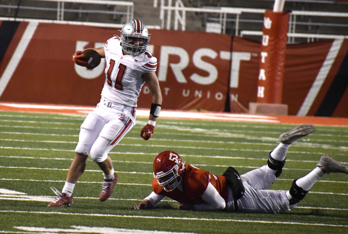 - Spanish Fork senior Brock Jacobson breaks a tackle during the 4A championship game against Crimson Cliffs at Rice-Eccles Stadium on Thursday, Nov. 21, 2024.