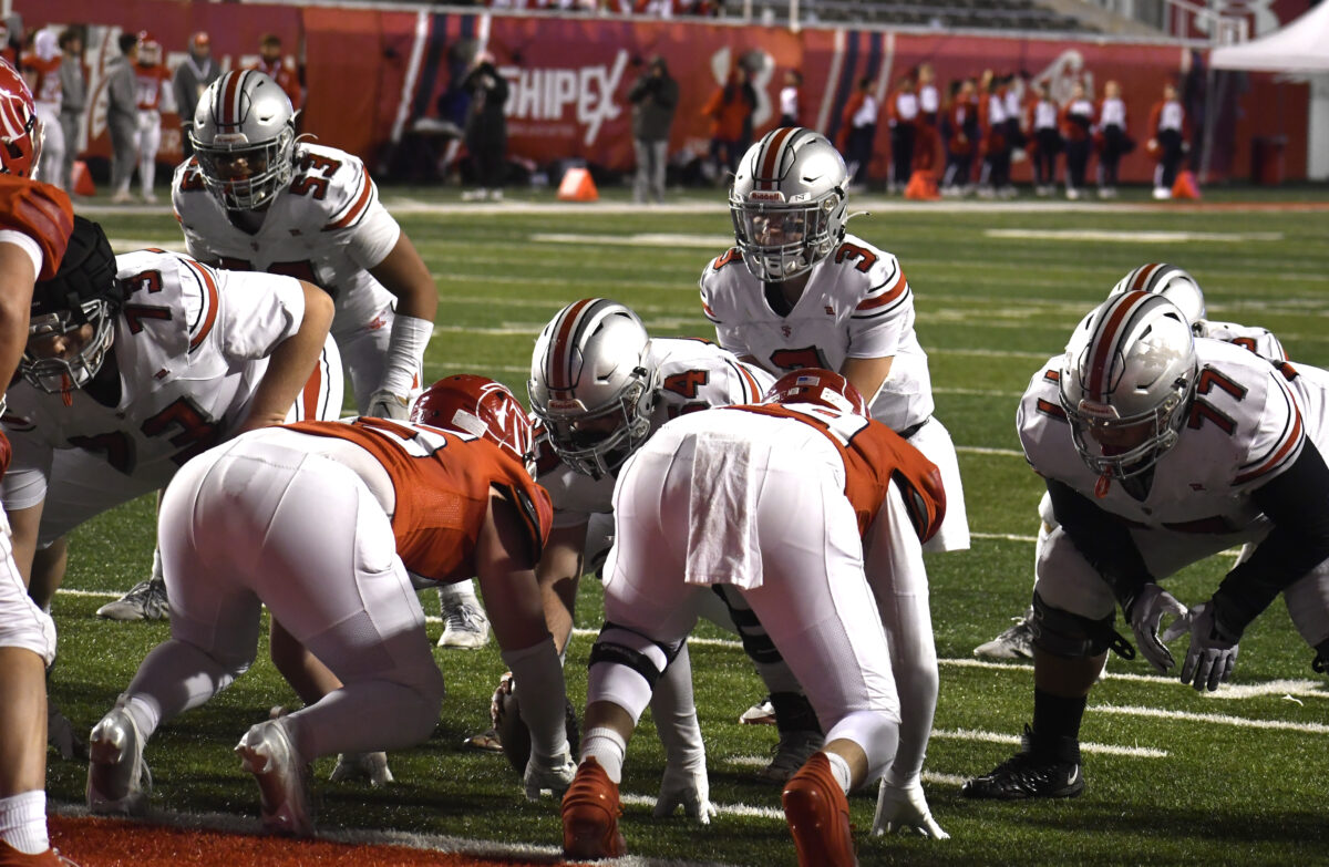 - Spanish Fork players prepare to run a play during the 4A championship game against Crimson Cliffs at Rice-Eccles Stadium on Thursday, Nov. 21, 2024.