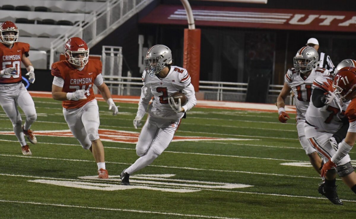 - Spanish Fork senior Kaden Vest carries the ball up the field during the 4A championship game against Crimson Cliffs at Rice-Eccles Stadium on Thursday, Nov. 21, 2024.