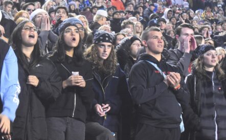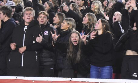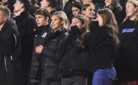 - Spanish Fork football fans react during the 4A state championship game against Crimson Cliffs at Rice-Eccles Stadium in Salt Lake City on Thursday, Nov. 21, 2024.