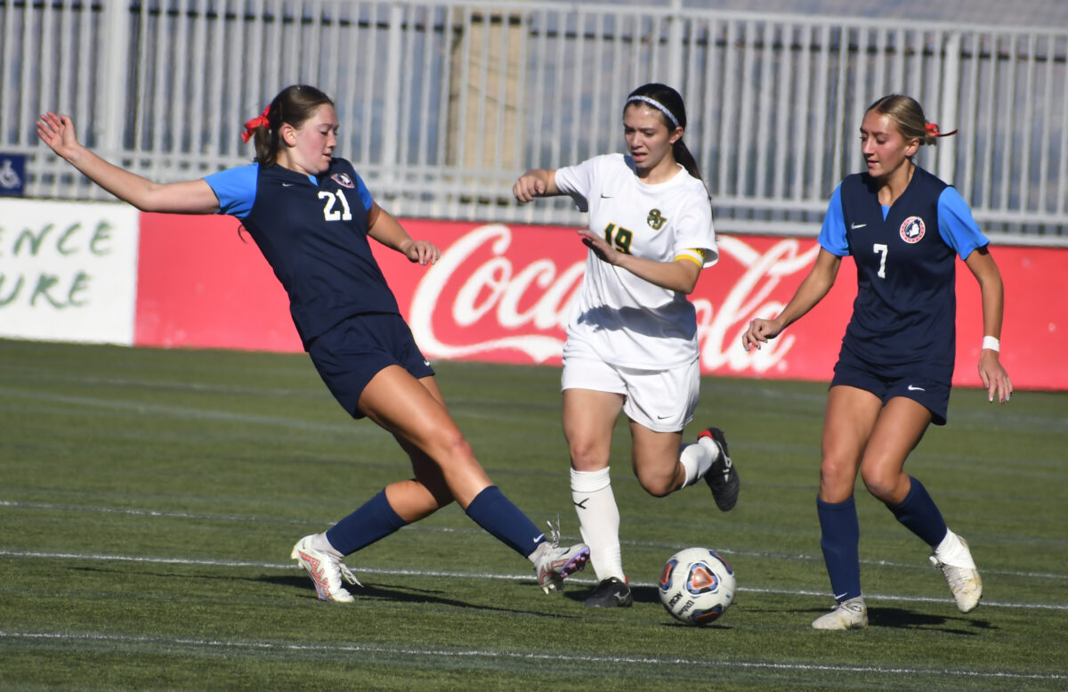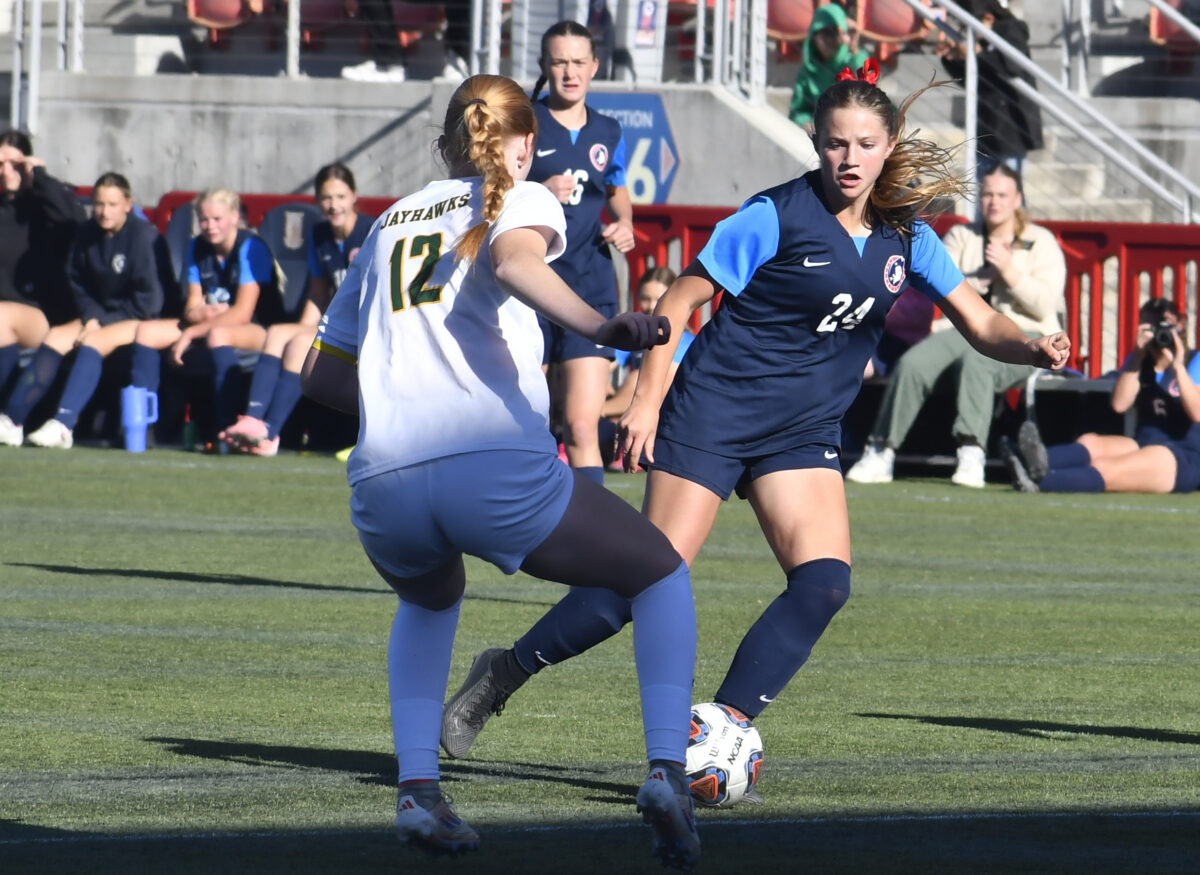 - American Heritage sophomore Sadie Stratton brings the ball up the field during the 2A semifinal game against St. Joseph at Zions Bank Stadium in Herriman on Thursday, Oct. 24, 2024.