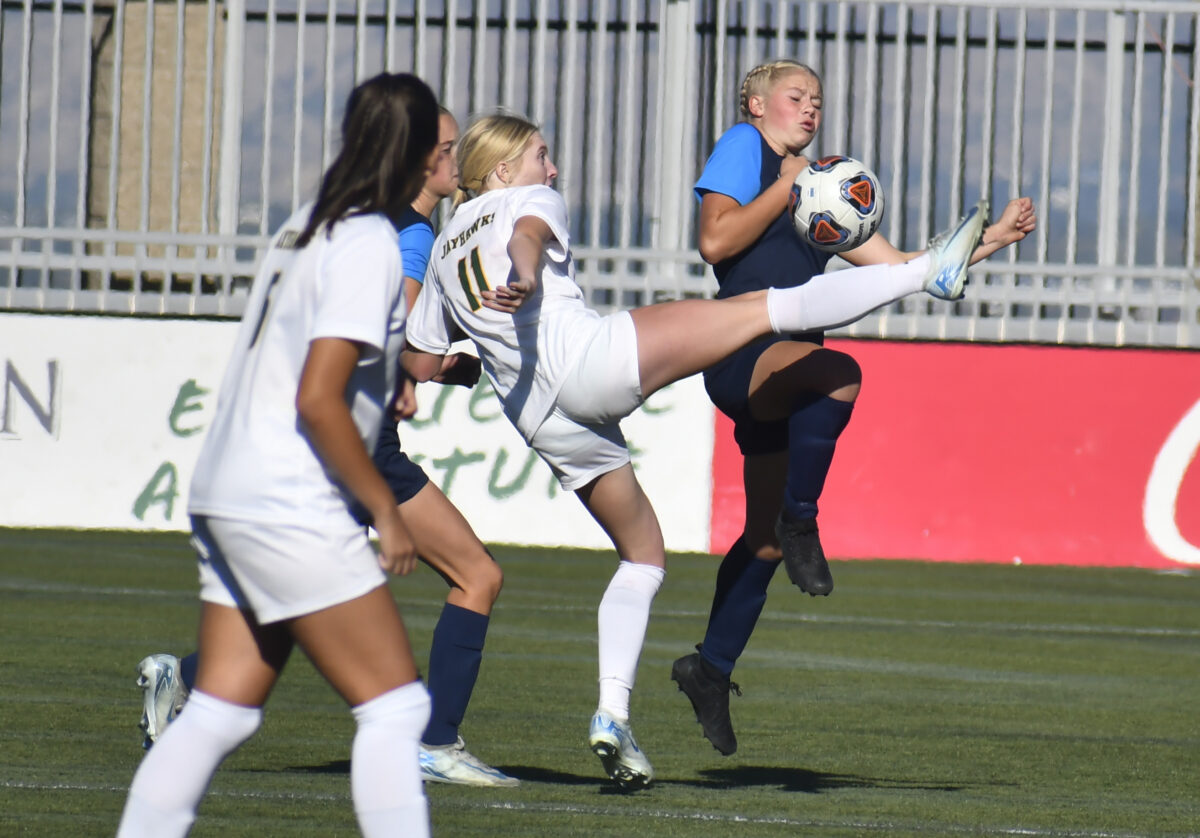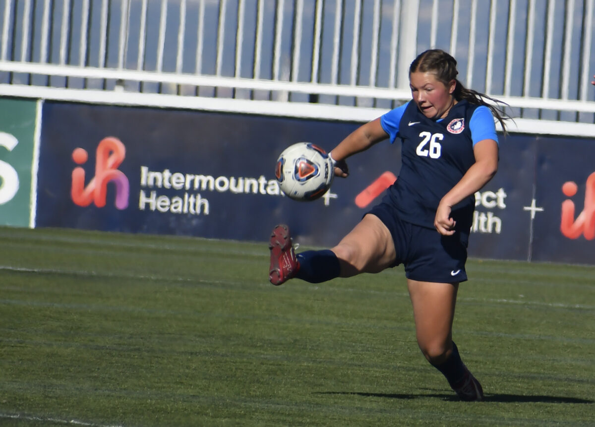 - American Heritage freshman Ada Werner takes a corner kick during the 2A semifinal game against St. Joseph at Zions Bank Stadium in Herriman on Thursday, Oct. 24, 2024.