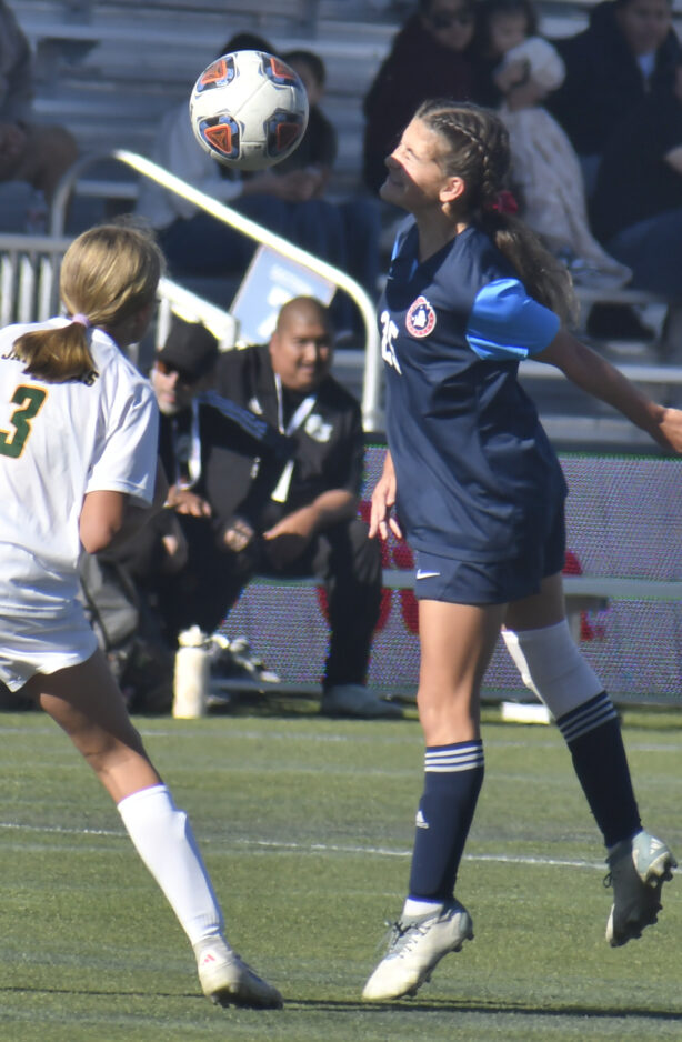 - American Heritage freshman Izzy Steele heads the ball during the 2A semifinal game against St. Joseph at Zions Bank Stadium in Herriman on Thursday, Oct. 24, 2024.