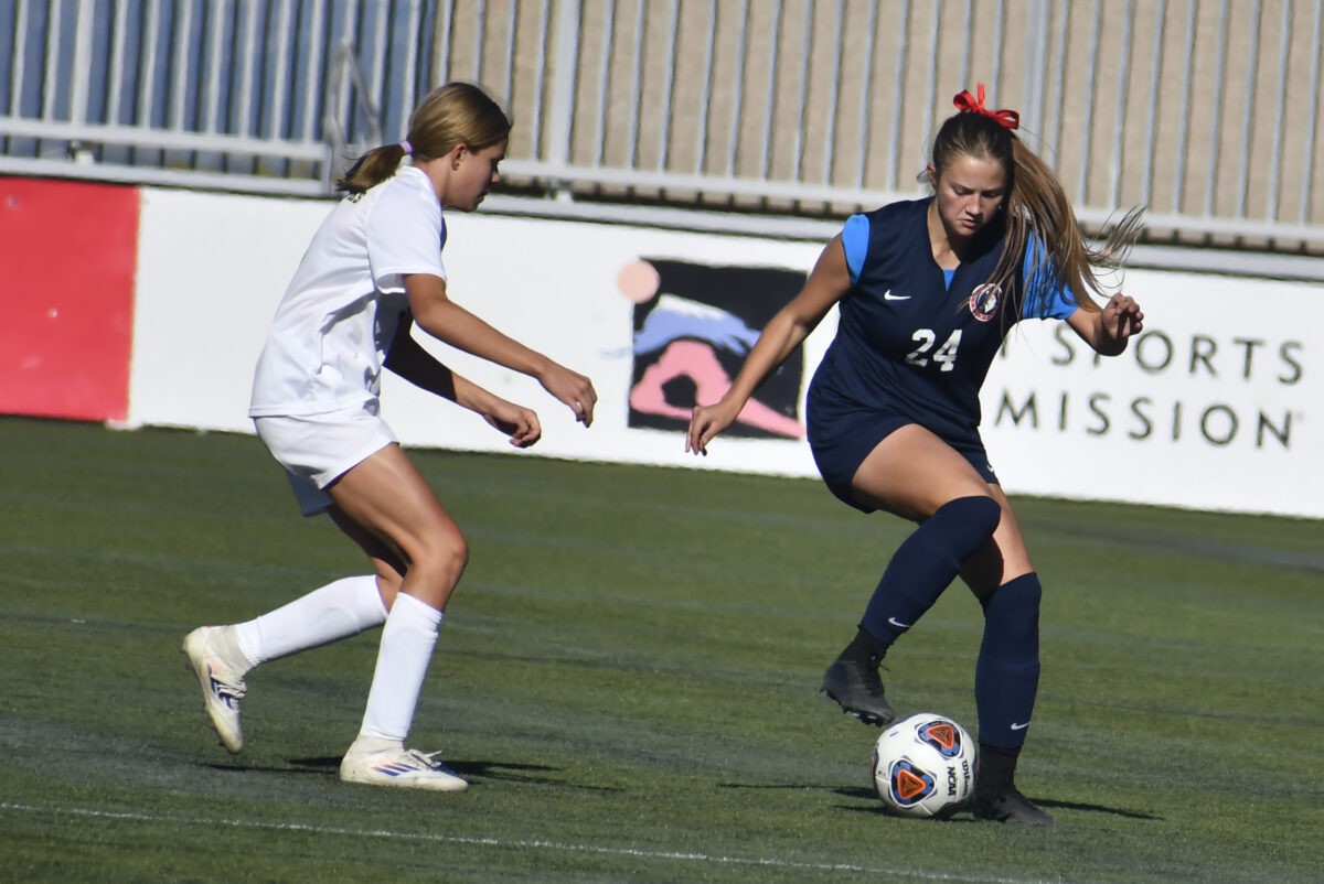 - American Heritage freshman Aurie Pack brings the ball up the field during the 2A semifinal game against St. Joseph at Zions Bank Stadium in Herriman on Thursday, Oct. 24, 2024.