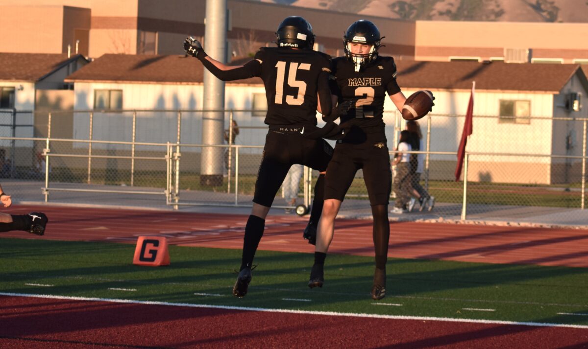 - Maple Mountain’s Sawyer Leifson (15) celebrates a touchdown scored by teammate Derek Morehouse in a high school football game against Pleasant Grove on Friday, Sept. 6, 2024.