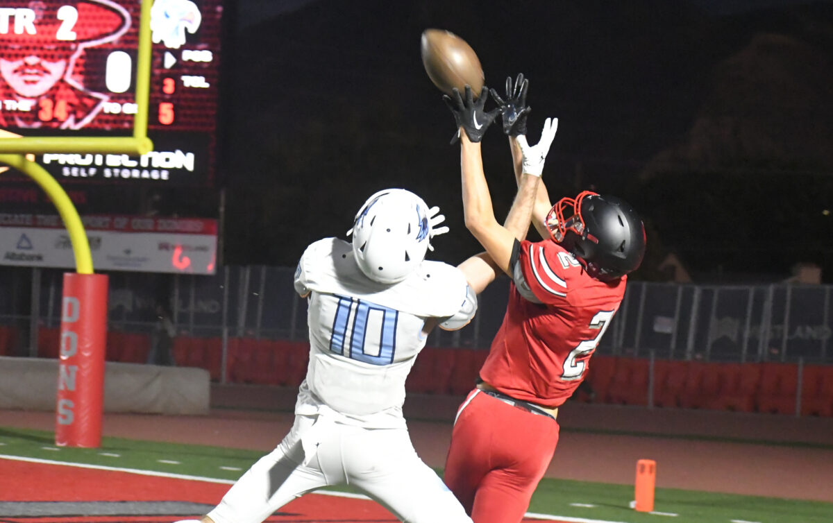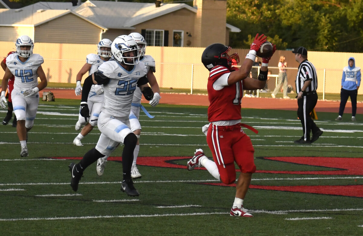 - Spanish Fork junior defensive back Gage Christensen (right) defends a pass during the Region 8 game against Salem Hills in Spanish Fork on Friday, Sept. 20, 2024.