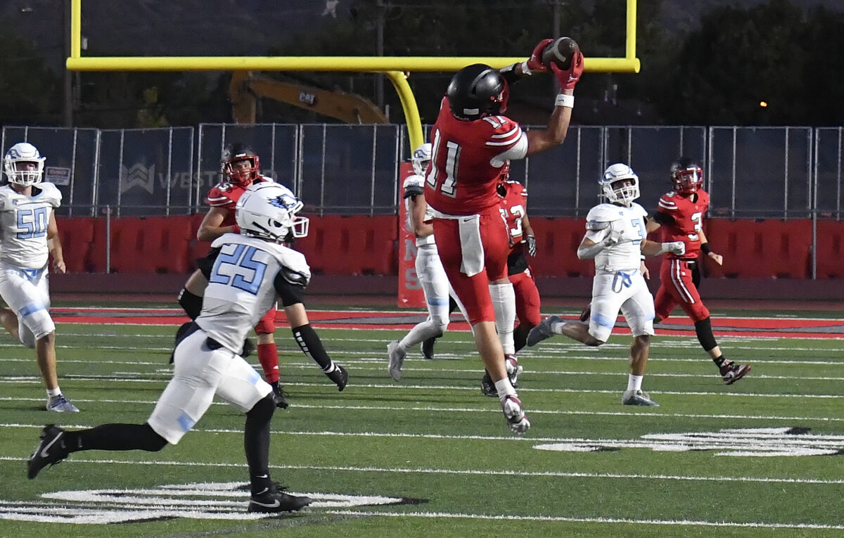 - Spanish Fork senior Brock Jacobson makes a catch during the Region 8 game against Salem Hills in Spanish Fork on Friday, Sept. 20, 2024.