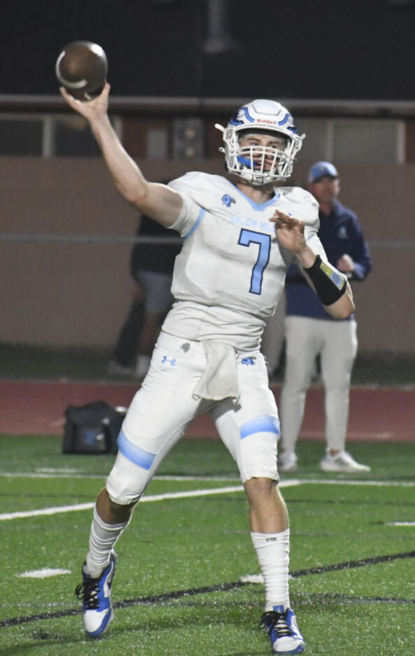 - Salem Hills senior Jedi Nelson throws a pass during the Region 8 game at Spanish Fork on Friday, Sept. 20, 2024.