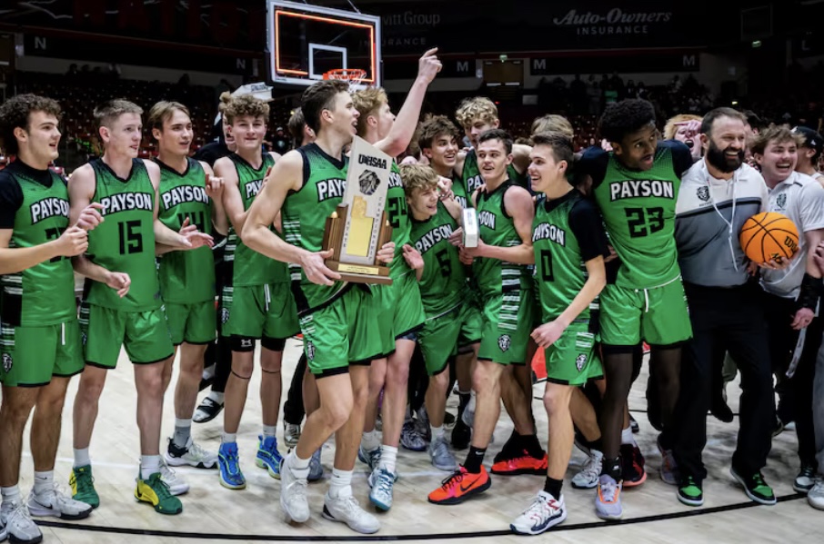 - Payson senior Legend Reynoso holds the state title trophy as he celebrates with his team after winning 4A state basketball tournament at the America First Events Center in Cedar City on Saturday, Feb. 22, 2025.