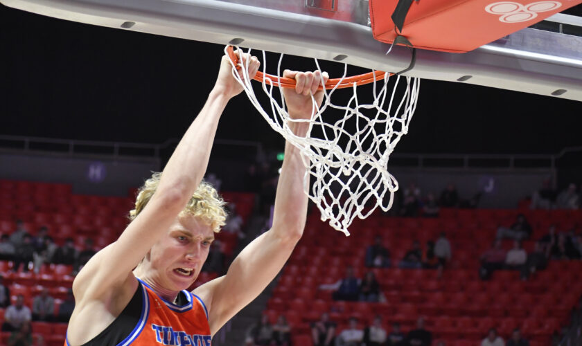 Timpview junior Dean Rueckert dunks the ball during the 5A semifinal game against Olympus at the Huntsman Center in Salt Lake City on Wednesday, Feb. 26, 2025.Daily Herald writers Darnell Dickson, Brandon Gurney and Brian E. Preece rank the top five Utah Valley teams in boys basketball, girls basketball, boys wrestling and girls wrestling for the week of Dec. 1.