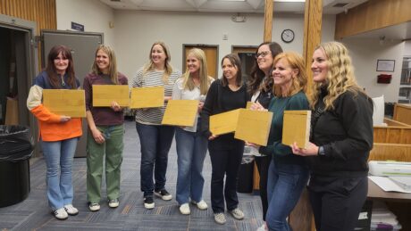 Members of the 1996 Timpview girls basketball team, which won state championship 30 years ago, pose with sections of the floor of the north gym at the school. The team was honored at halftime of the T-Birds game against Cedar Valley on Tuesday, Feb. 4, 2025. From left to right: Head coach Barbara Dickson, Erin Atkinson Clegg, Amanda Valgardson Poulson, Erin Atkinson Clegg, Ashley Rencher Sanders, Heidi Sorensen Smith, Emily Freeze Walbruch and Julie Chambers Poulson.