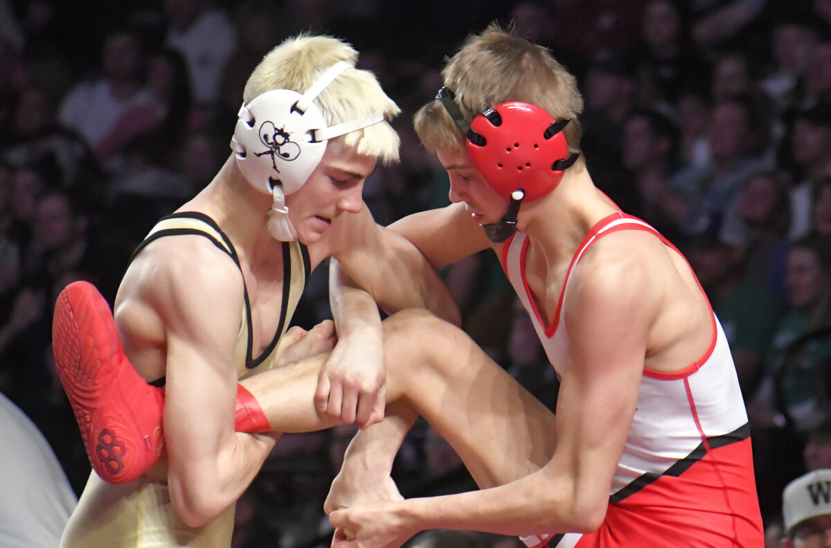 - Spanish Fork’s Ryker Olson competes in the 165-pound title match at the 5A finals at the UCCU Center in Orem on Wednesday, Feb. 12, 2025.