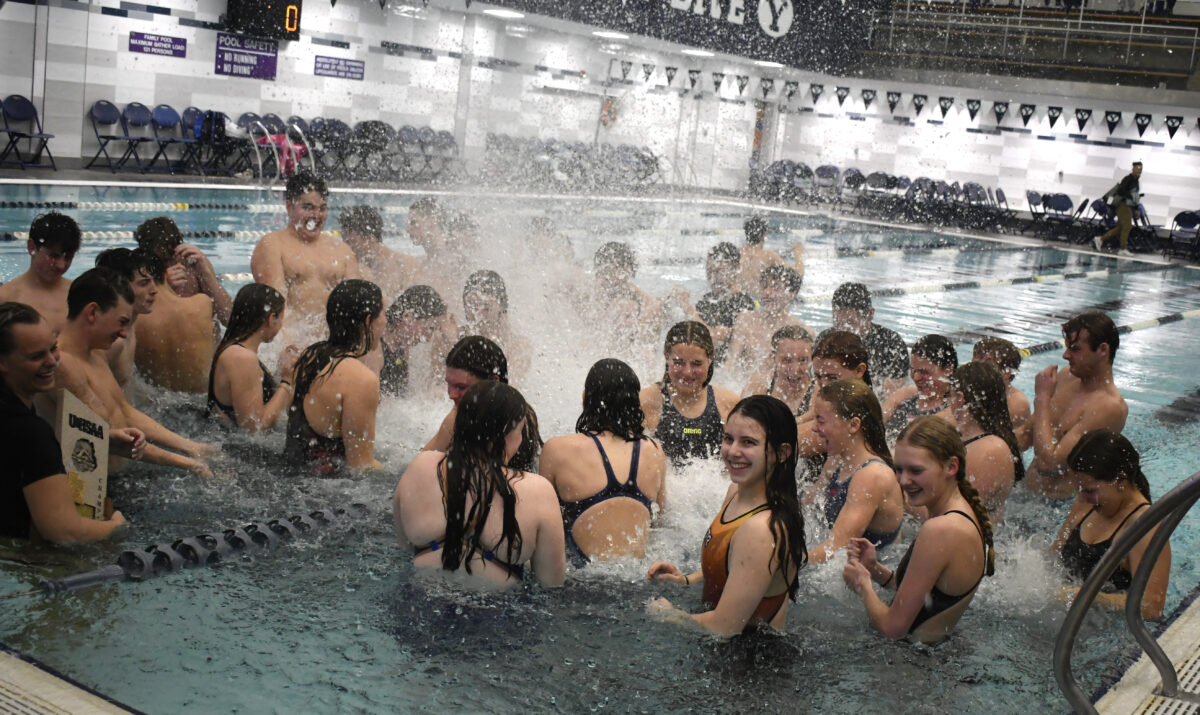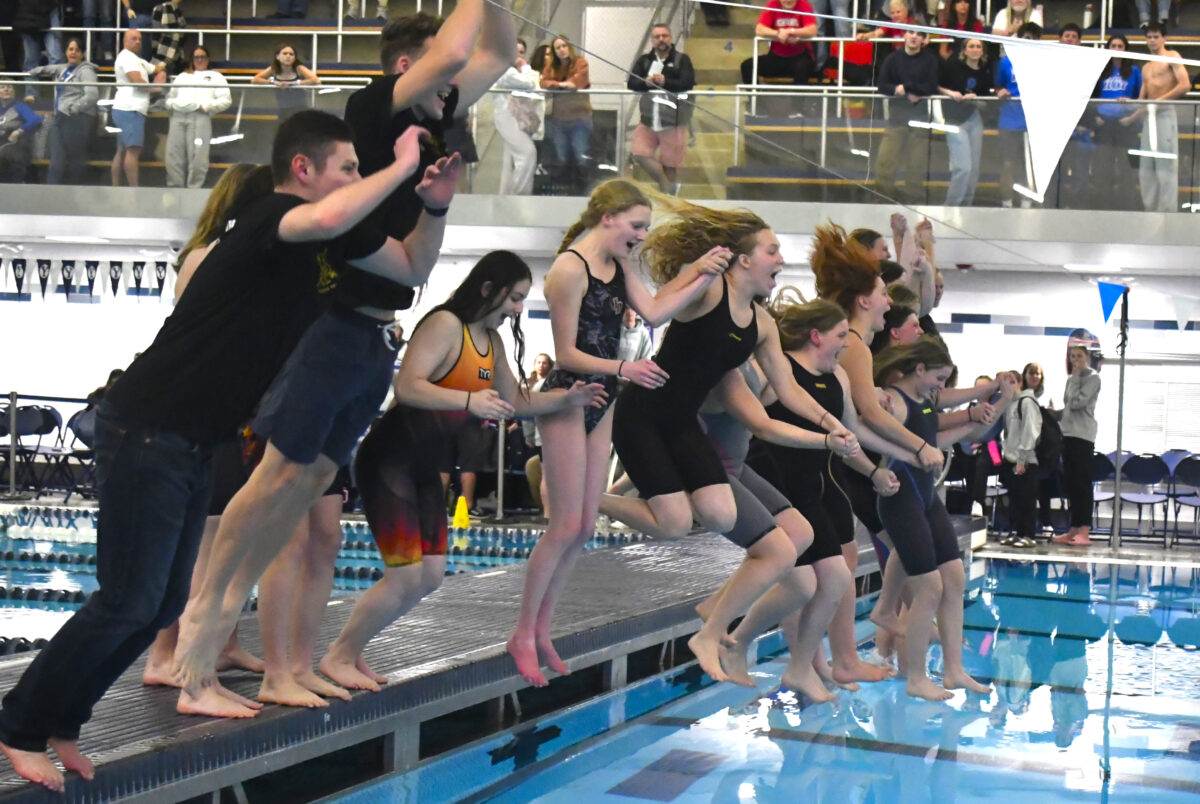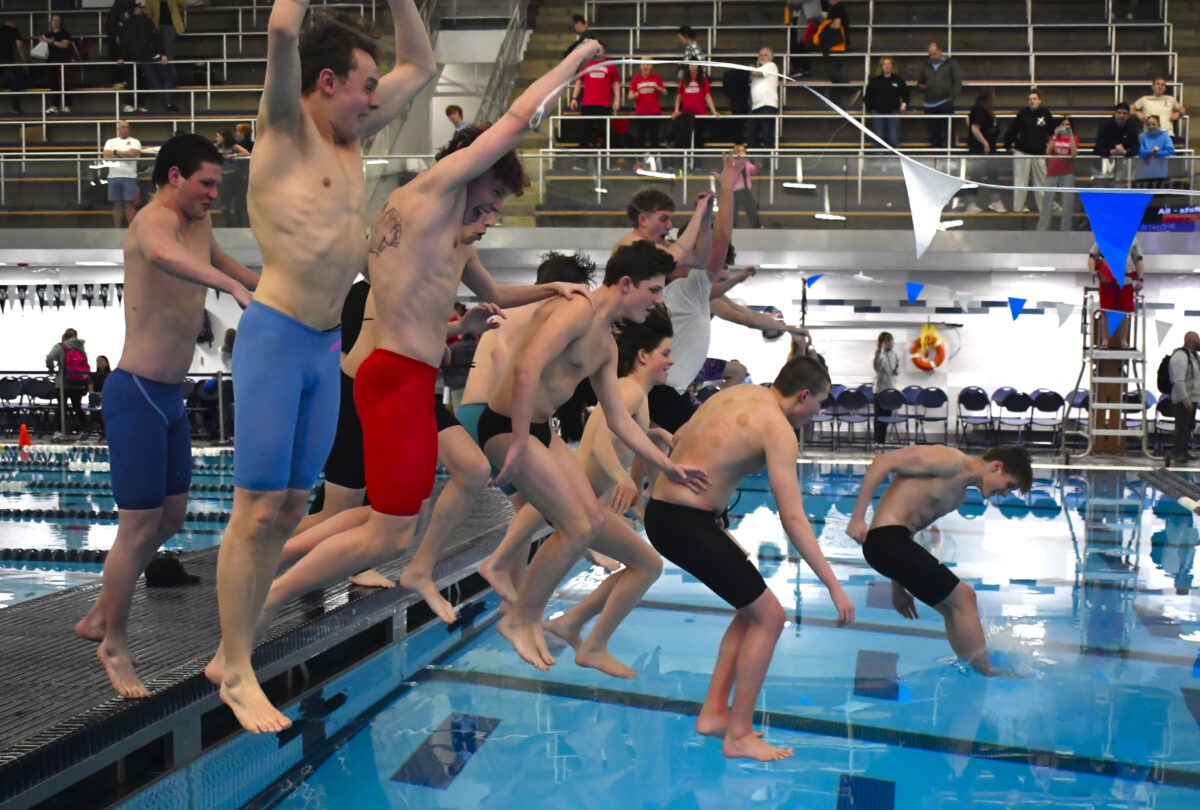 - The American Fork boys swim team celebrates winning the state title by jumping into the pool after the 6A finals at the Richards Building in Provo on Saturday, Feb. 15, 2025.