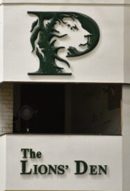 - The school logo and sign for the Lions’ Den sit on the wall of the gym at Payson High School.