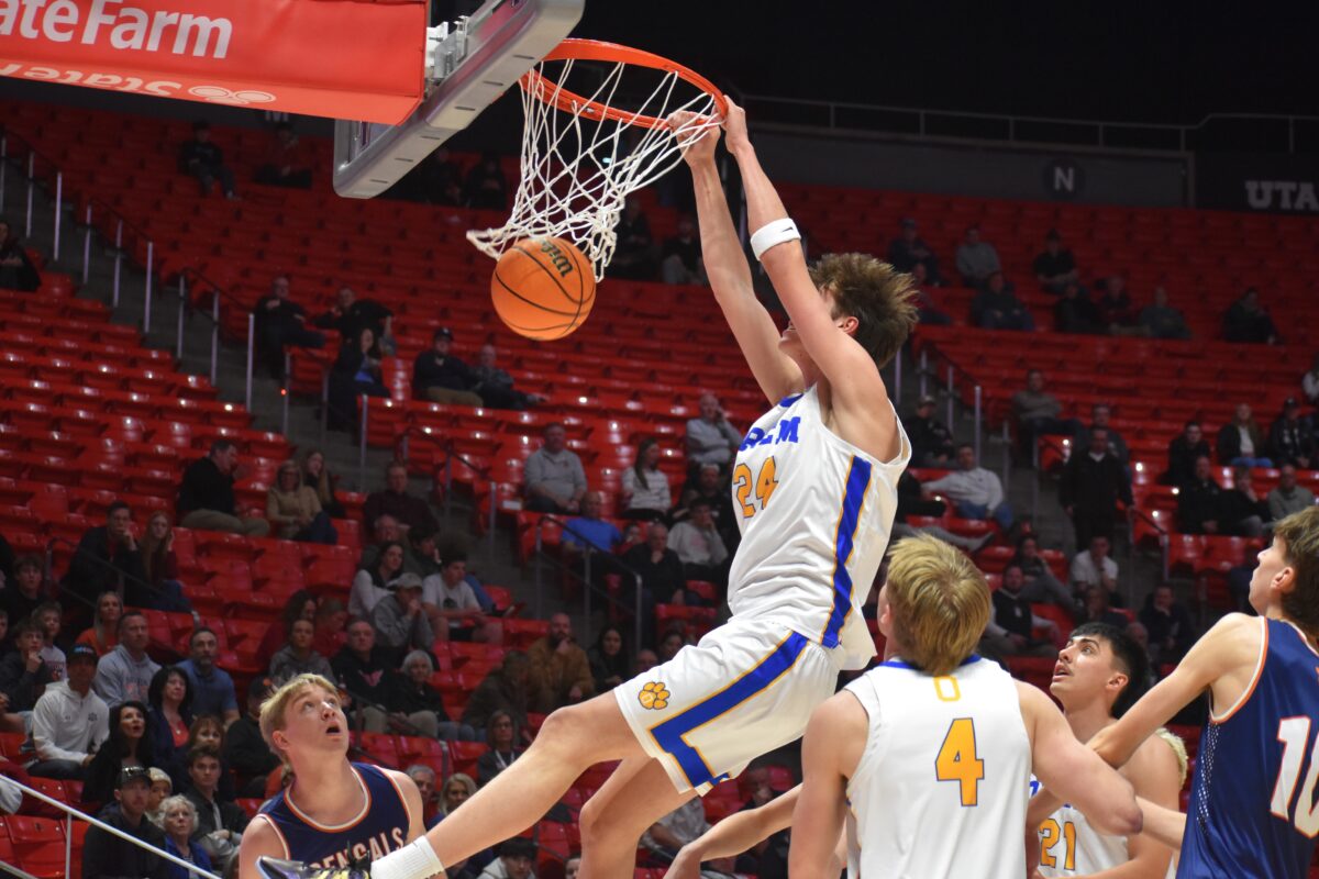 - Orem’s Chamberlain Burgess (24) dunks the ball in a 5A boys state quarterfinal game at the Huntsman Center in Salt Lake City on Tuesday, Feb, 25, 2025.