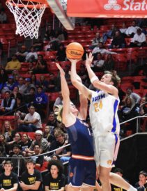 Suguturaga grabbed the ball out of the air and hurriedly put it up off the board just before time expired — only to have the game-tying shot hit too strong, ricocheting off to miss on the other side of the rim and capping Brighton’s dramatic upset.