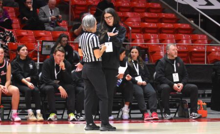 - Spanish Fork girls basketball coach Brynlie Nielsen, right, talks to an official during a 5A girls basketball state quarterfinal against Bountiful at the Huntsman Center in Salt Lake City on Tuesday, Feb. 25, 2025.