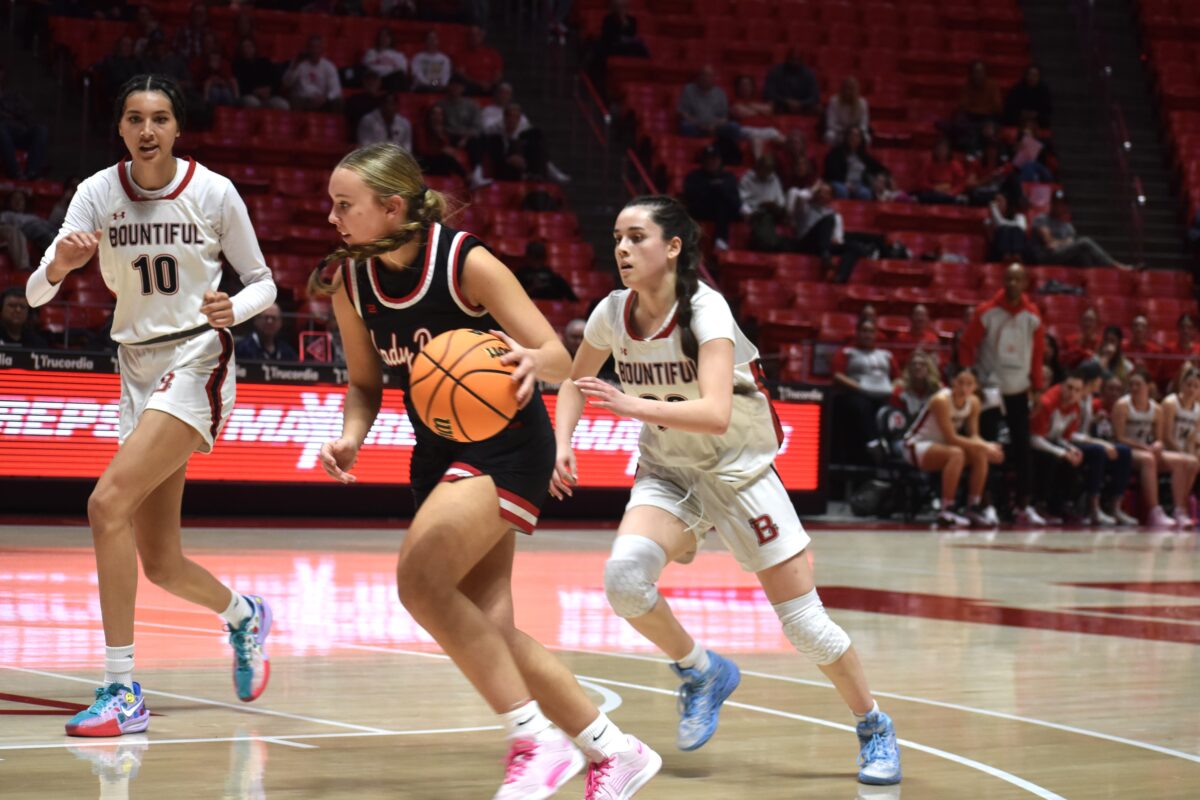 - Spanish Fork’s Audrey Anderson (1) dribbles against Bountiful in a 5A girls basketball state quarterfinal game at the Huntsman Center in Salt Lake City on Tuesday, Feb. 25, 2025.