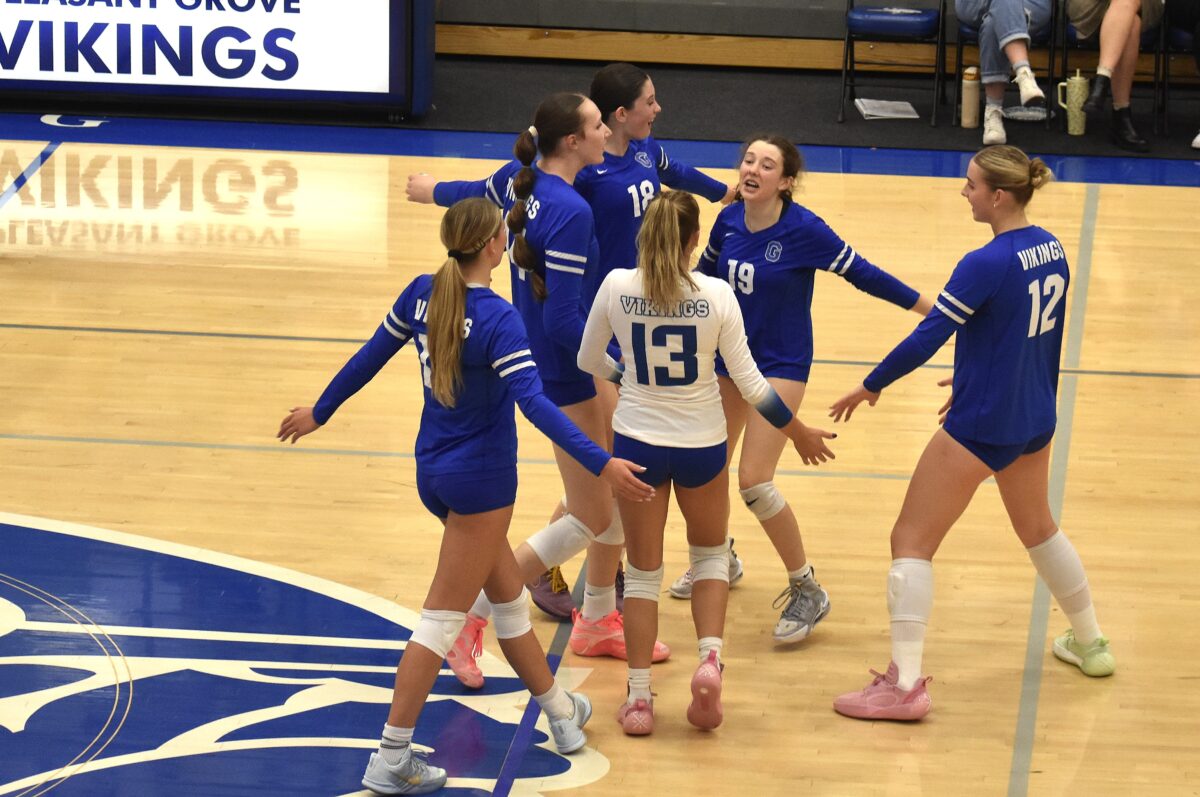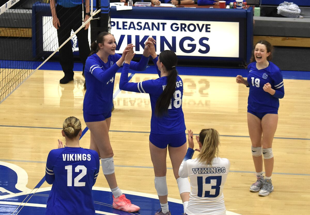 - Pleasant Grove players celebrate a point in a Region 7 girls volleyball match against Maple Mountain on Thursday, Oct. 2, 2025.