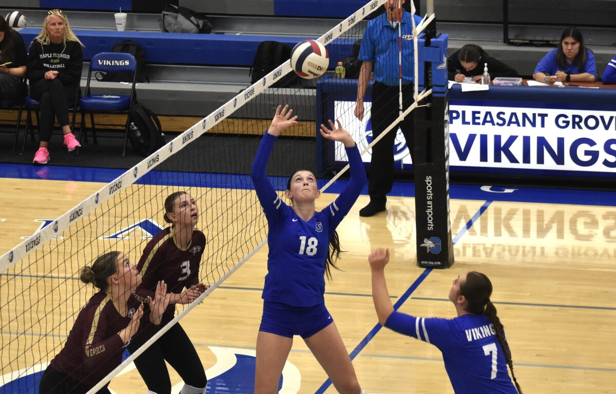 Pleasant Grove put themselves in a good position with a stunning comeback in Set 2. After winning the first set by seven points, the Vikings fell behind early in as Maple Mountain, behind top hitter Karli Smith, came out hot. The Golden Eagles led 8-2 on an Avery Brimhall kill and held a 14-5 advantage after an ace from Hallie Huntsman. A kill by Smith gave Maple Mountain a 23-17 advantage but PG rallied and went on an 8-0 run. Sophomore setter Marley McCandless scored on a an attack, Addie Beck fired off an ace and a pair of Golden Eagle errors allowed the home team to forge a 23-23 tie. Marli Vaea’s attack scored to get the Vikings to set point and junior pin hitter Lexi Brown sent her shot off the Maple Mountain block for the winner and a 2-0 lead in the match.