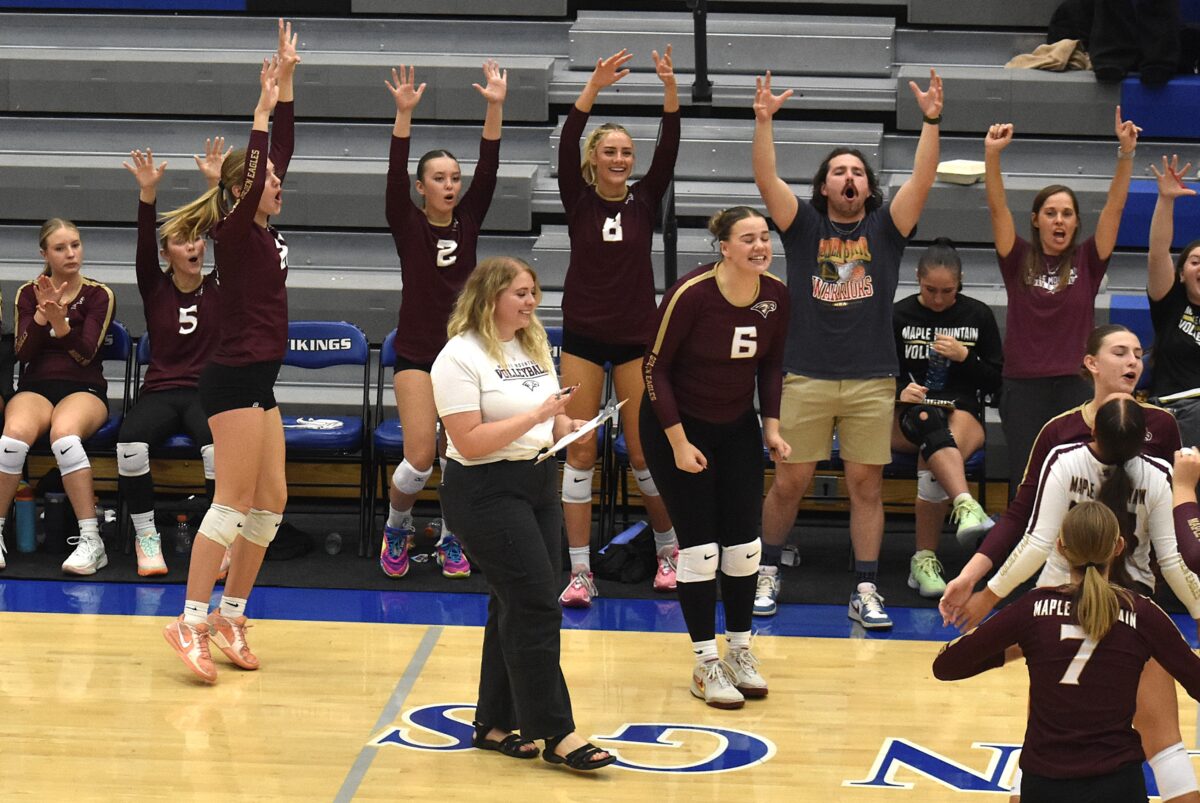 - Maple Mountain volleyball players celebrate a point in a Region 7 match against Pleasant Grove on Thursday, Oct. 2, 2025.
