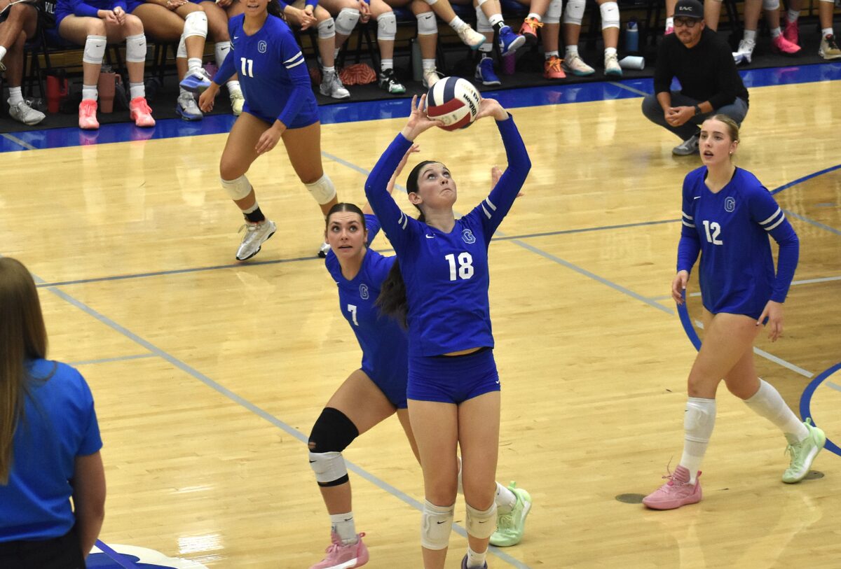 - Pleasant Grove’s Marley McCandless (18) sets the ball during a Region 7 girls volleyball match against Maple Mountain on Thursday, Oct. 2, 2025.
