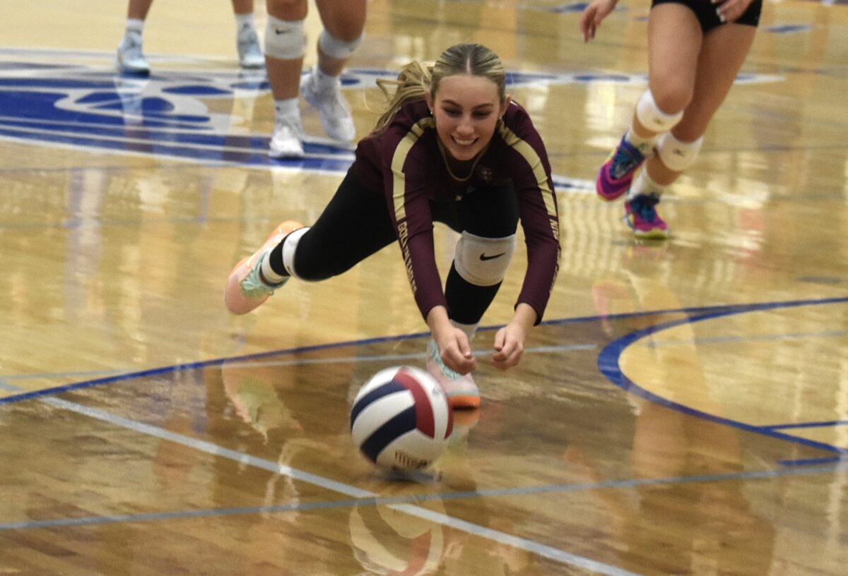 - Maple Mountain’s Olivia Roberts dives for a ball in a Region 7 girls volleyball match against Pleasant Grove on Thursday, Oct. 2, 2025.