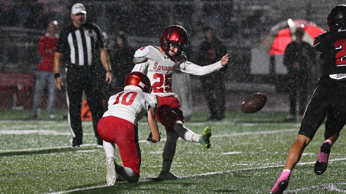 - Springville’s Ben Smith (25) attempts a field goal from the hold of Sawyer Grover in a Region 7 football game on Thursday, Oct. 9, 2025
