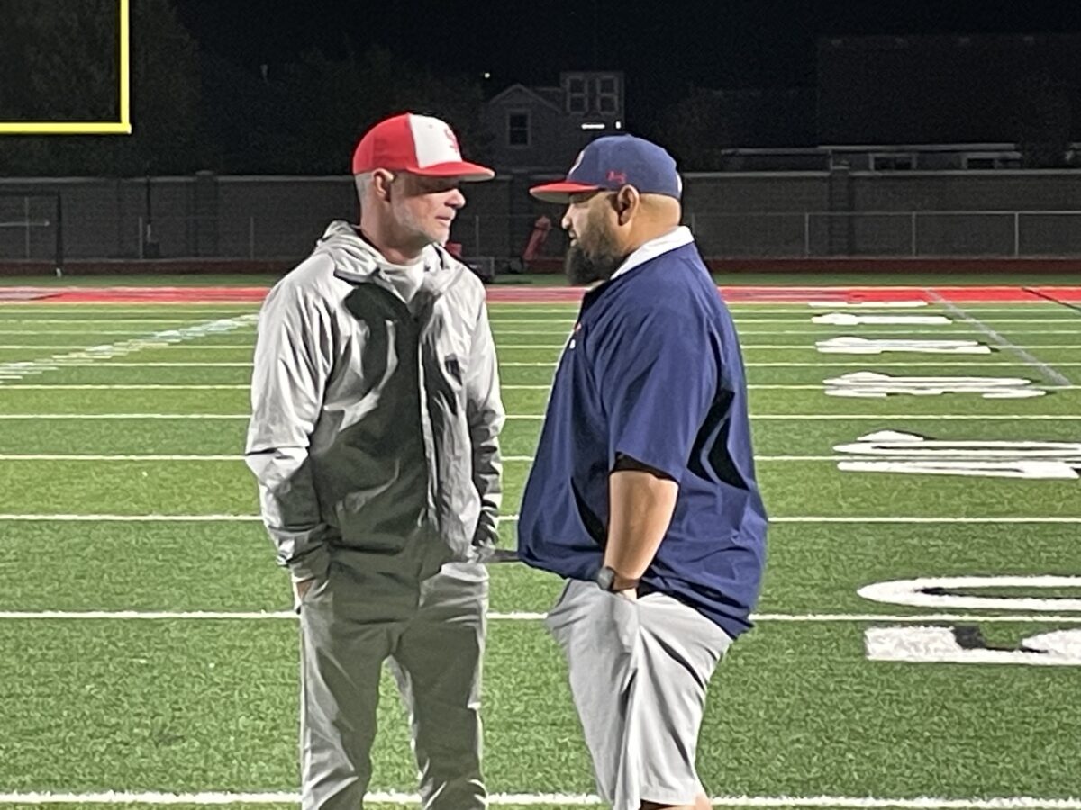 - Springville head football coach Dave Valeti (right) talks to Spanish Fork head coach Dustin Smith after the Red Devils’ 49-3 Region 7 victory on Thursday, Oct. 10, 2025.