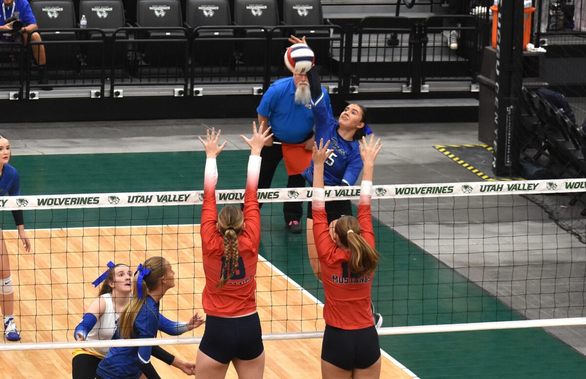 Mountain View rolled to victories in the first two sets against No. 5 Crimson Cliffs in their quarterfinal match (25-14, 25-12) but the Mustangs turned things around with defense and a strong block, winning the final three sets 25-19, 25-23, 15-12 to advance to the semifinals against Orem.