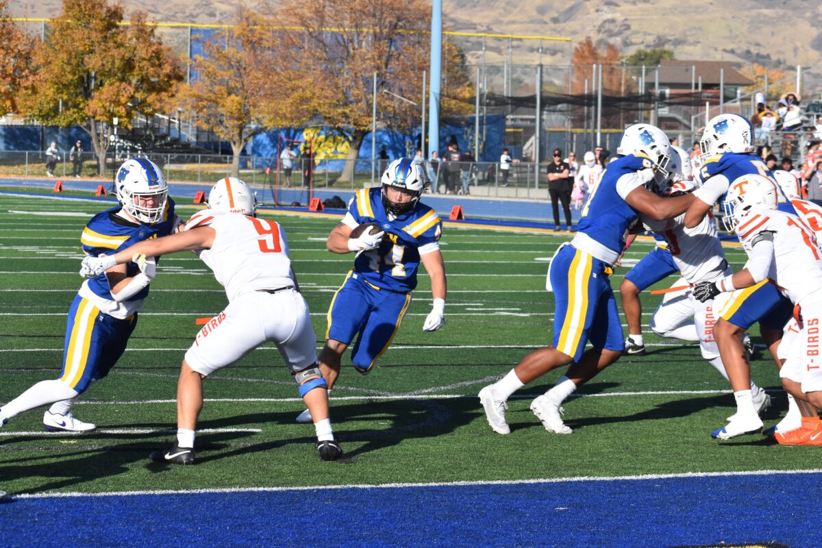 Leading 7-0, Aisa Galeai’s punt was downed at the Timpview 1-yard line. The Orem defense swarmed all over a T-Bird rushing attempt and got the safety for a 9-0 lead.