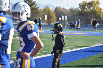 - A young Orem High football fan stands on the sidelines in full gear on Halloween (Oct. 31, 2025) at a 5A state playoff game against Timpview.
