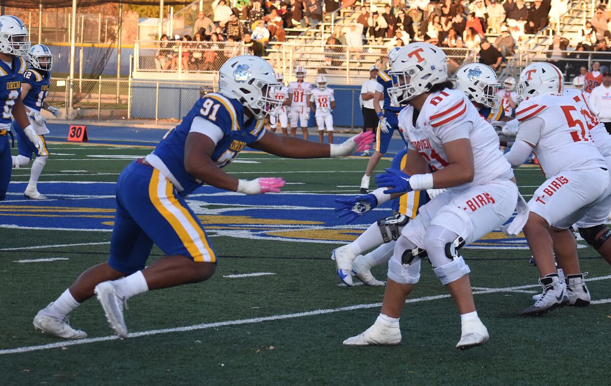 - Timpview’s Oliver Rueckert (right) dives at Orem quarterback Tayden Ka’awa in a 5A football state second round game on Friday, Oct. 31, 2025.