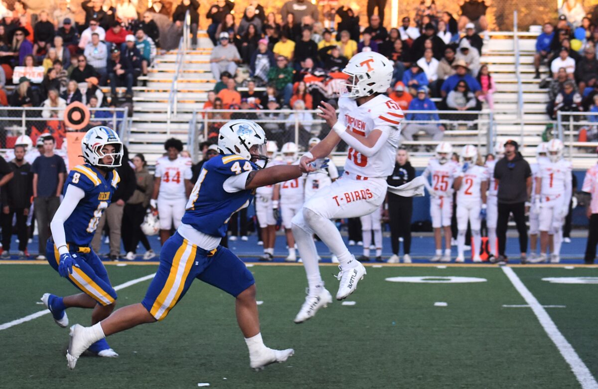- Orem’s Brock Hawkins (21) reaches to break up a pass to Timpview’s Steel Richards in a 5A football state second round game on Friday, Oct. 31, 2025.