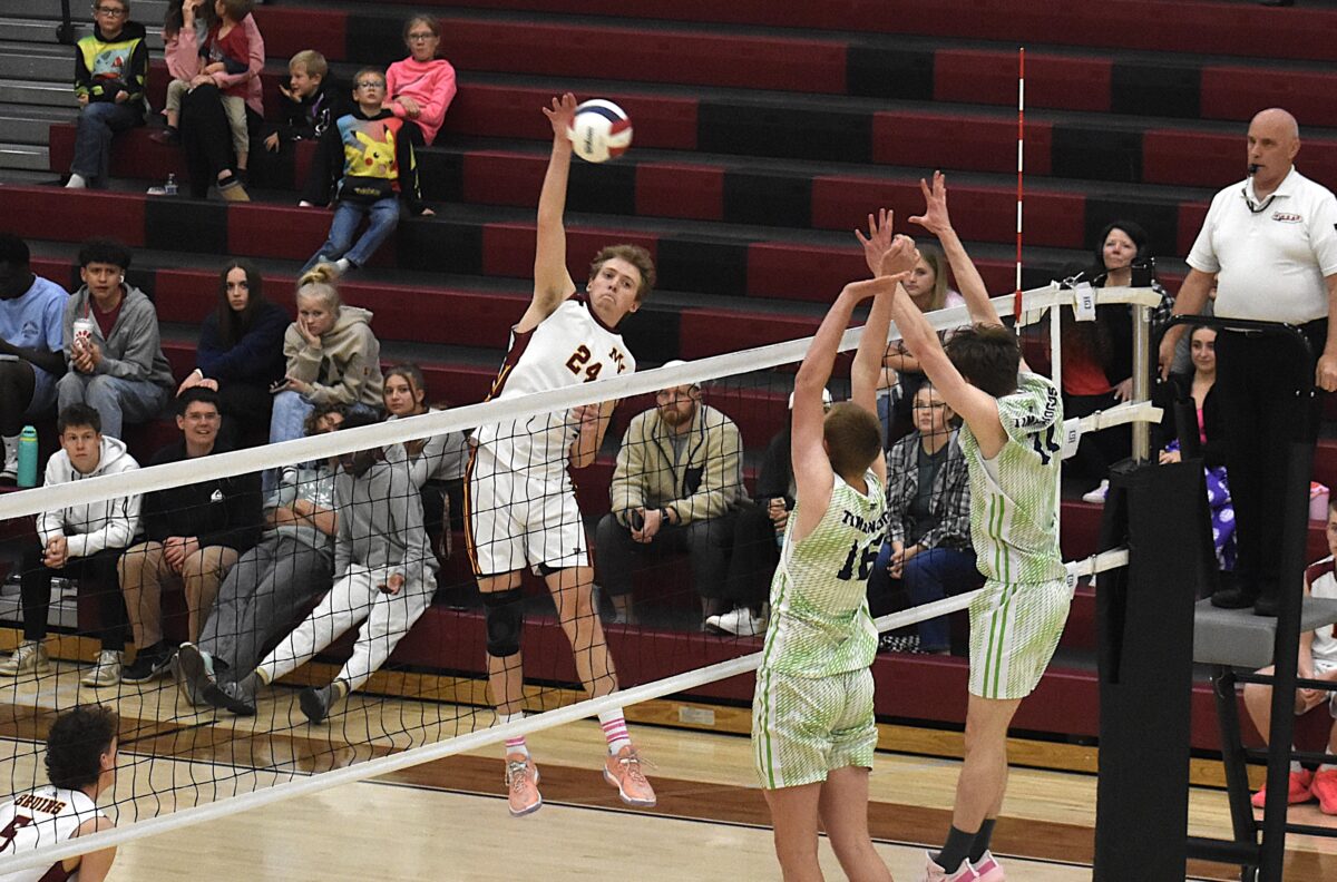 Timpanogos, which had lost six straight matches heading into Thursday, found a good rhythm and recovered from a first set loss to win Set 2, then rode that momentum into the third set. Three straight points — an ace from Grant Osborn, a kill from Brig Woahn and a combo block from Woahn and Zaxon Downey — gave the Timberwolves a commanding 13-7 lead. Timpanogos got to 22-16 after Alexander Wright fired down a kill but Mountain View responded with an 8-1 run — mostly on Timberwolves errors — to get to set point at 24-23.