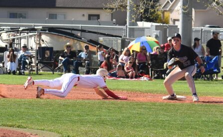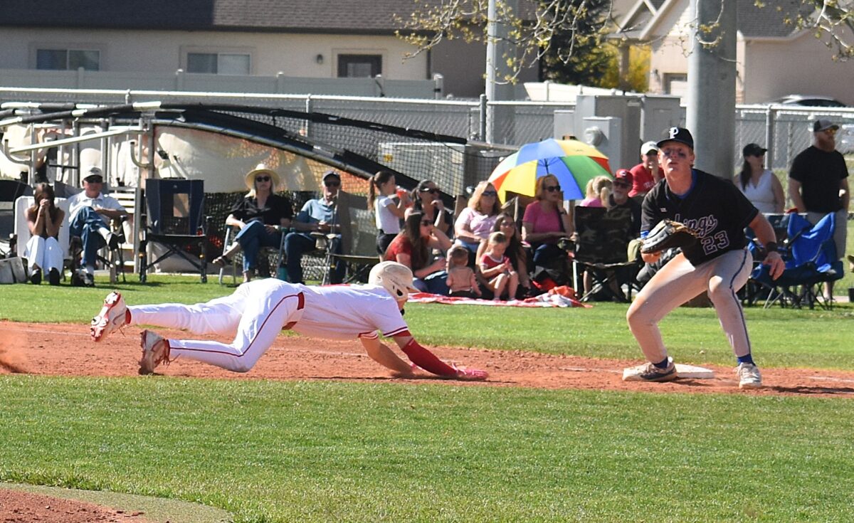 - Spanish Fork’s Boston Duvall, left, dives back to first base as Pleasant Grove’s Damon Banks awaits the throw in a Region 7 baseball game on Tuesday, April 7, 2026.