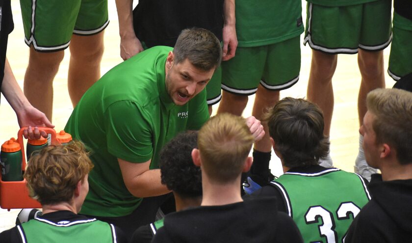 Provo boys basketball coach Chris Collinsworth (center) instructs his team in a time out during a Region 8 game at Mountain View on Tuesday, Jan. 20, 2026.Trailing by 19 points at halftime of its 4A quarterfinal game with No. 8 Sky View, top-seeded Provo’s outlook of getting to the state finals seemed pretty grim.