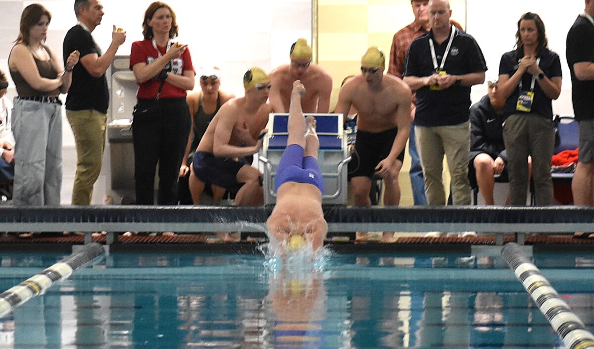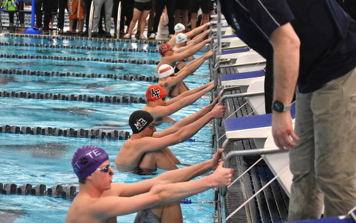 - Swimmers line up to compete in the 6A boys 100 backstroke during the state championships at the BYU Pool on Saturday, Feb. 21, 2026. Results can be found on B4.