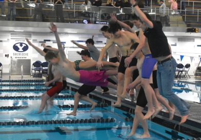 - The Lone Peak boys swimming team celebrates winning the 6A title by jumping into the BYU Pool on Saturday, Feb. 21, 2026.